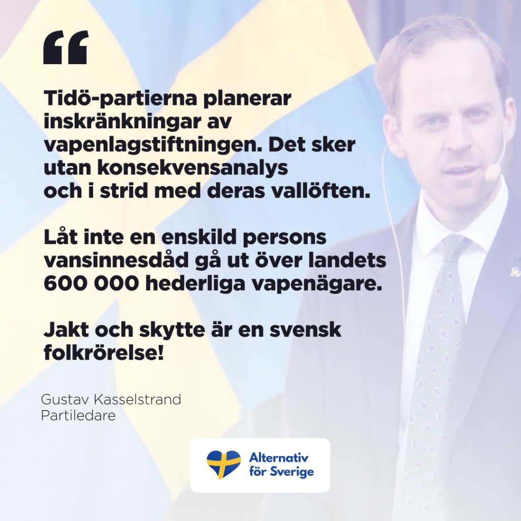 “Tidö-partierna planerar inskränkningar av vapenlagstiftningen. Det sker utan konsekvensanalys och i strid med deras vallöften. Låt inte en enskild persons vansinnesdåd gå ut över landets 600 000 hederliga vapenägare. Jakt och skytte är en svensk folkrörelse!”