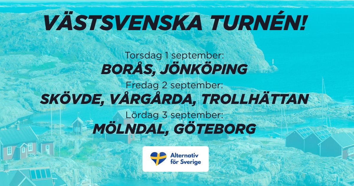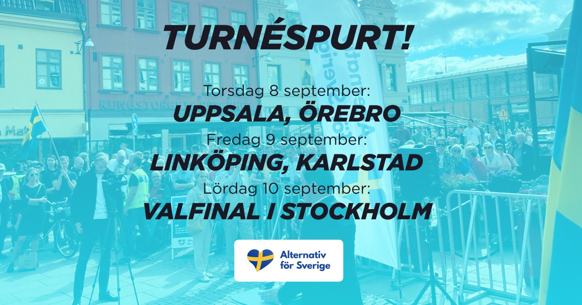 Alternativ för Sveriges landsomfattande återvandringsturné besökte förra veckan Norrland, vilket blev en formidabel succé. Nu är det dags för den sydsvenska turnén då partiet håller torgmöten i landets fyra sydligaste län Skåne, Blekinge, Kronoberg och Halland. Torsdag 25 augusti12:00 Helsingborg, Konsul Olssons plats17:00 Hässleholm, Stortorget Fredag 26 augusti11:00 Olofström, Nya torget14:00 Växjö, Speakers corner18:00 Halmstad,… Fortsätt läsa Alternativ för Sverige på sydsvensk turné
