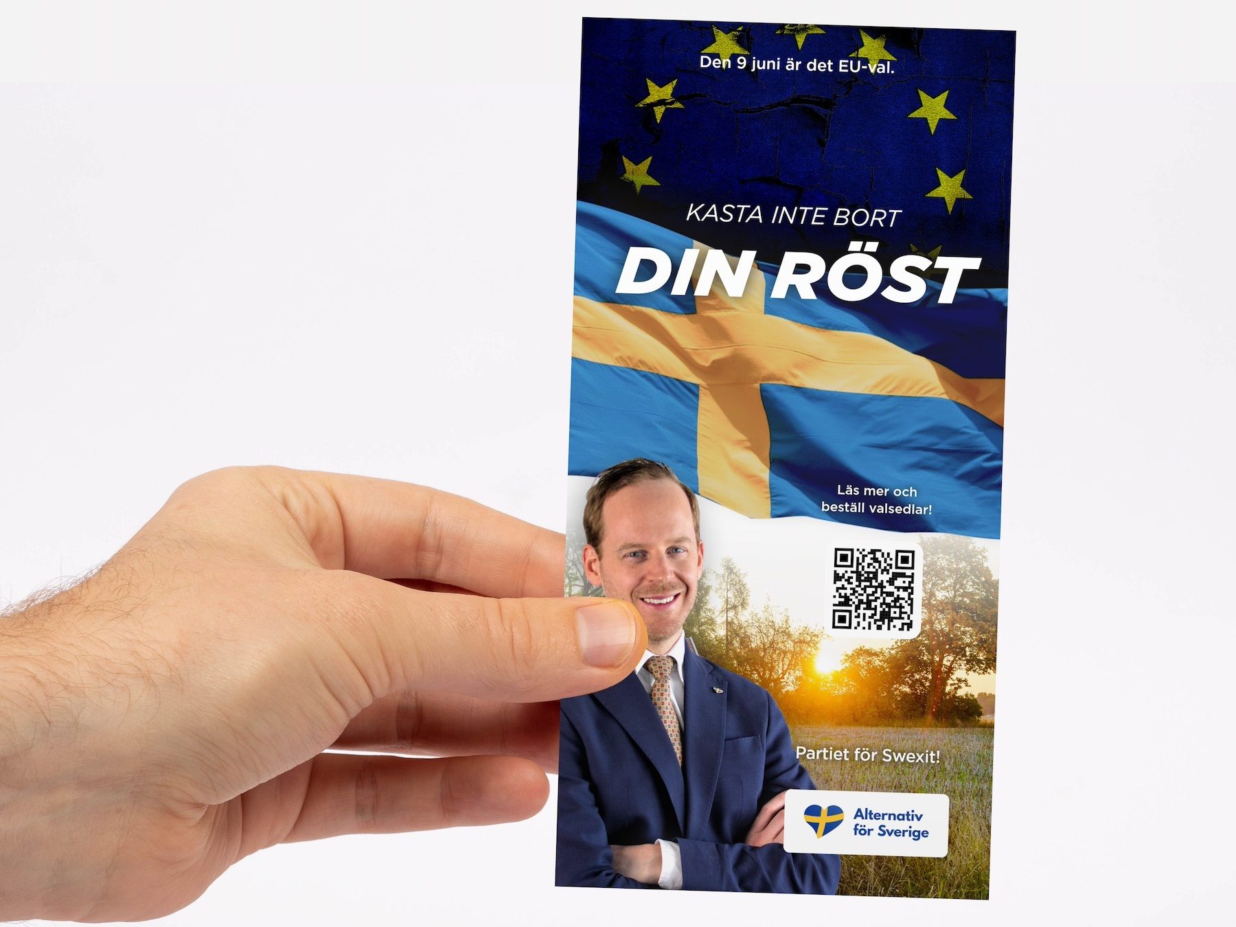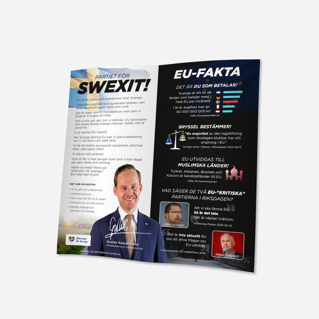 Inför EU-valet har Alternativ för Sverige tagit fram en valfolder som tryckts i hundratusentals exemplar. Denna och nästa vecka levereras foldern till partiets kretsar över hela landet.