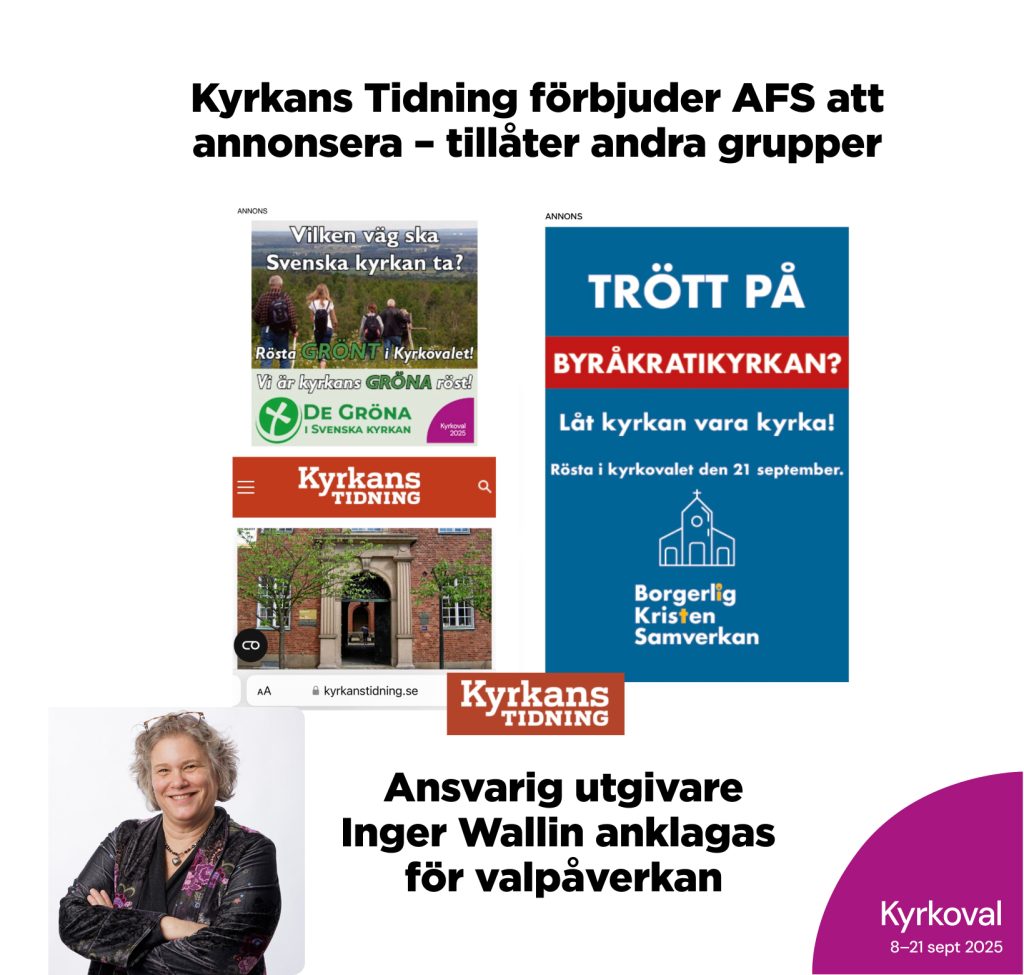– Nu intensifieras även valpåverkan genom det kyrkomediala etablissemanget. “Ett parti som inte förtjänar legitimitet eller exponering över huvud taget. I alla fall inte i en tidning på kristen grund”, skrev Marcus Pollack, utvecklingsredaktör för den kristna tidningen Hemmet vän, om AFS. Han är inte ensam om att företräda den linjen: tidningen Dagen har infört annonsförbud mot AFS, och nu har även Kyrkans tidning gjort detsamma. Det sker samtidigt som alla andra grupper tillåts annonsera. Ansvariga utgivaren Inger Wallin ägnar sig åt valpåverkan med det enda syftet att försvåra AFS chanser att bli omvalda.
