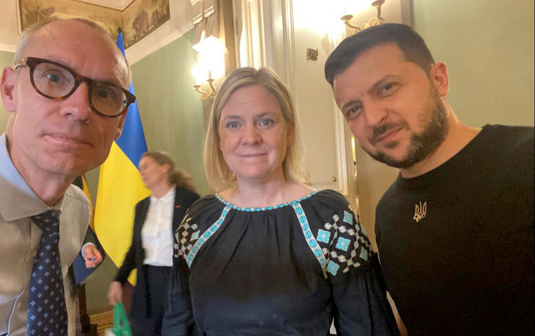 Sveriges chefsförhandlare om Natoanslutningen, Oscar Stenström, åkte i hemlighet till Bilderbergmötet som hölls den 18–21 maj i Lissabon, Portugal. På fotot ses Stenström (t.v.) på besök i Ukraina tillsammans med partikollegan Magdalena Andersson, här på selfie tillsammans med president Volodymyr Zelenskyj. Foto: Facebook