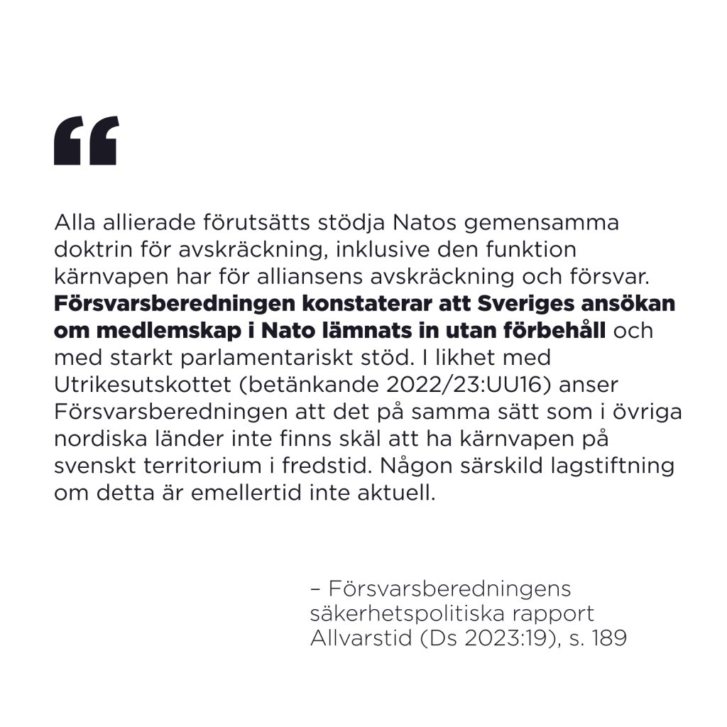 “Har du ens läst den rapport du själv varit med och godkänt? Det framgår tydligt att ansökan har lämnats in utan några förbehåll. Lagstiftning mot kärnvapen på svensk mark – i fredstid eller krig – är “inte aktuell””.