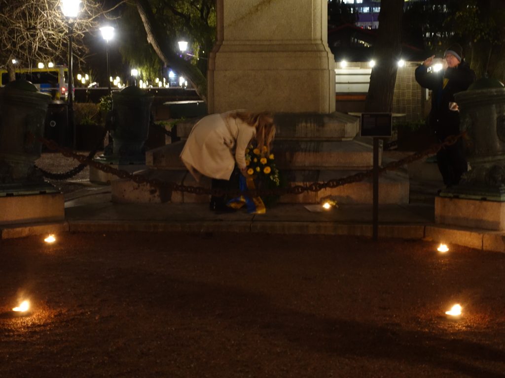 Mellan 100 och 150 personer hade anslutit till Kungsträdgården för att lyssna på partiledare Gustav Kasselstrand. Han talade inte bara om Karl XII:s liv och levnad, utan om vikten av att hämta kraft i historien under kristider. På så sätt kombinerades både historia och nutid i talet. Just nu befinner vi oss mitt inne i flera parallella kriser, och behovet av att högtidlighålla 30 november är därför större än på länge. Kasselstrand påminde också om att traditionen att högtidlighålla den 30 november går mer än 150 år tillbaka, och att folkets vilja att samlas kring sin historia alltid har varit som starkast under svåra tider.