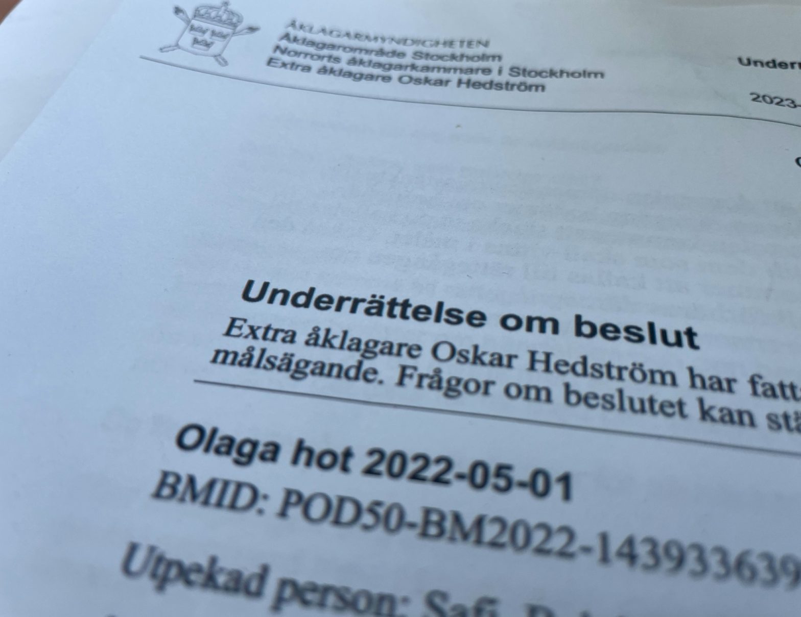 Nu, omkring ett år efter händelsen, har Norrorts åklagarkammare i Stockholm beslutat att väcka åtal mot mannen för olaga hot. Beslutet är fattat av extra åklagare Oskar Hedström.