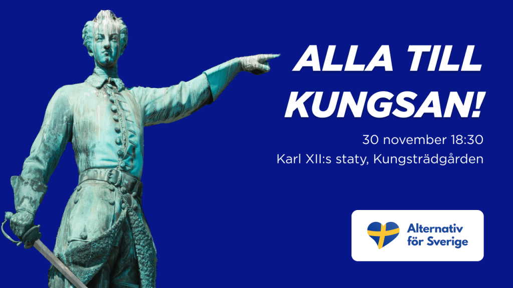 Redan efter några veckor med den borgerliga regeringen står det klart att folkutbytet kommer att fortsätta som tidigare. För varje dag delas nya uppehållstillstånd och medborgarskap ut i rekordstora mängder till invandrare som inte borde ha det. Svenska folket röstade för förändring, men fick det inte. Alternativ för Sverige kallar därför till ett torgmöte den 30 november vid Karl XII-statyn i Stockholm med parollen “Stoppa folkutbytet – Återvandring nu!”.