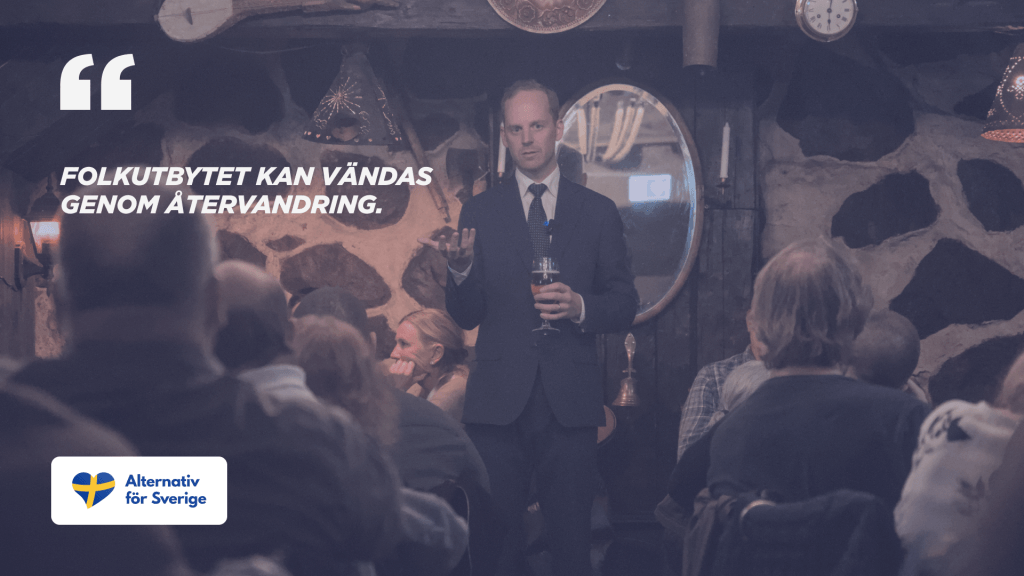 Invandringen driver på ett folkutbyte som är så långt gånget att svenskarna på sikt kommer att bli en minoritet i sitt eget land. Exakt när minoritetssituationen har inträffat kommer dock inte vara möjligt att fastslå då myndigheterna mörkar dessa uppgifter: där räknas tredje generationens invandrare som fullt ut svenska. Forskare, som Kyösti Tarvainen, har dock bedömt att situationen inträffar omkring år 2058 om ingen återvandring verkställs.